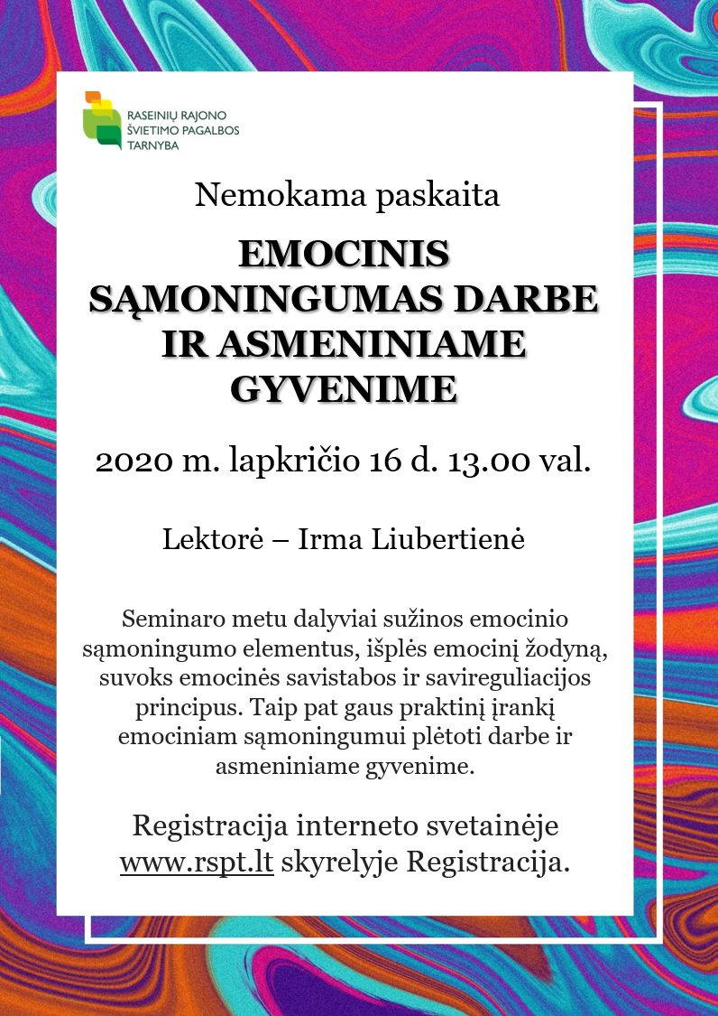 Seminaro anotacija: Seminaro metu dalyviai sužinos emocinio sąmoningumo elementus, išplės emocinį žodyną, suvoks emocinės savistabos ir savireguliacijos principus. Taip pat gaus praktinį įrankį emociniam sąmoningumui plėtoti darbe ir asmeniniame gyvenime.