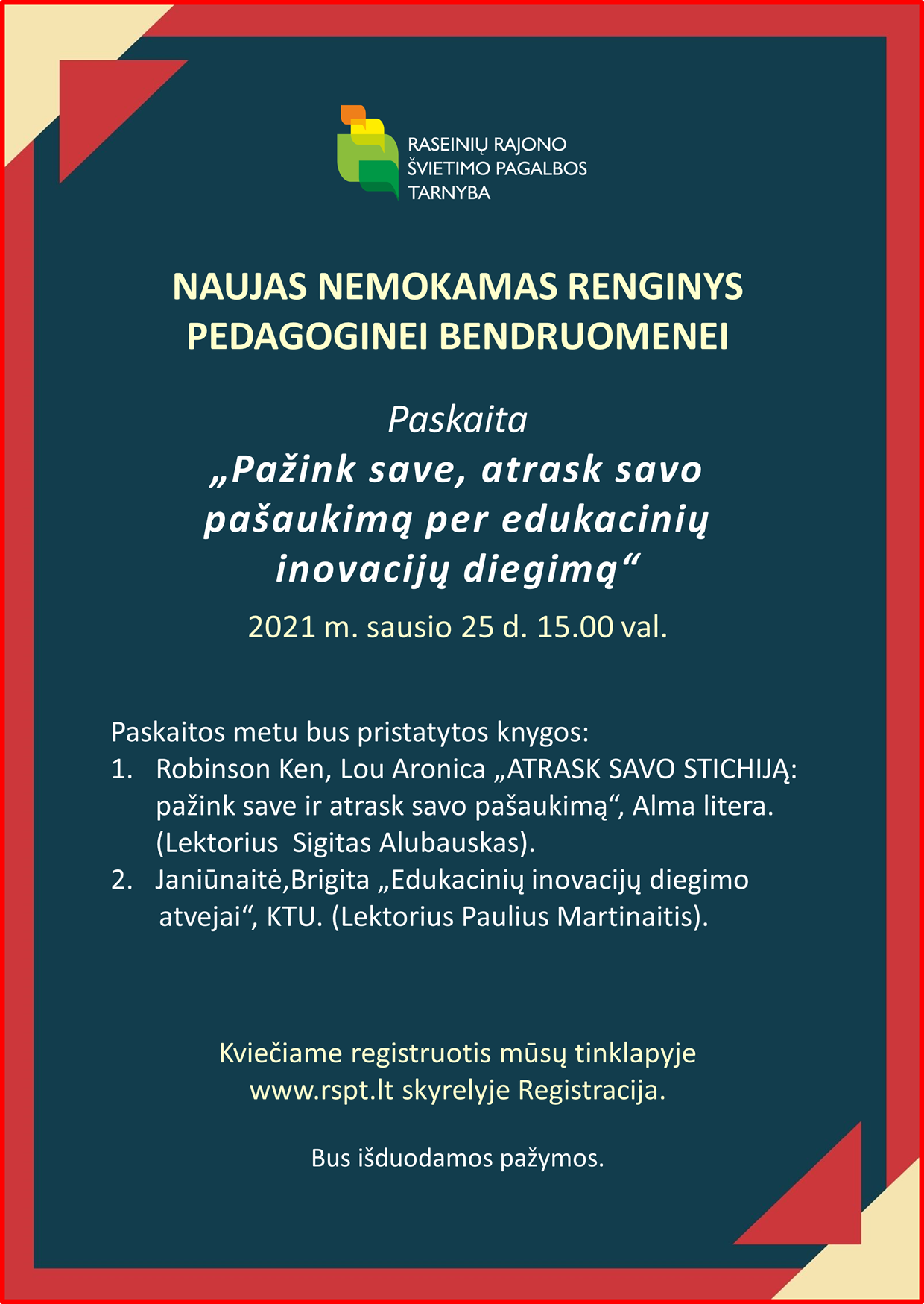 Robinson, Ken, Lou, Aronica. ATRASK SAVO STICHIJĄ: pažink save ir atrask savo pašaukimą, Alma litera. (Lektorius Sigitas Alubauskas).