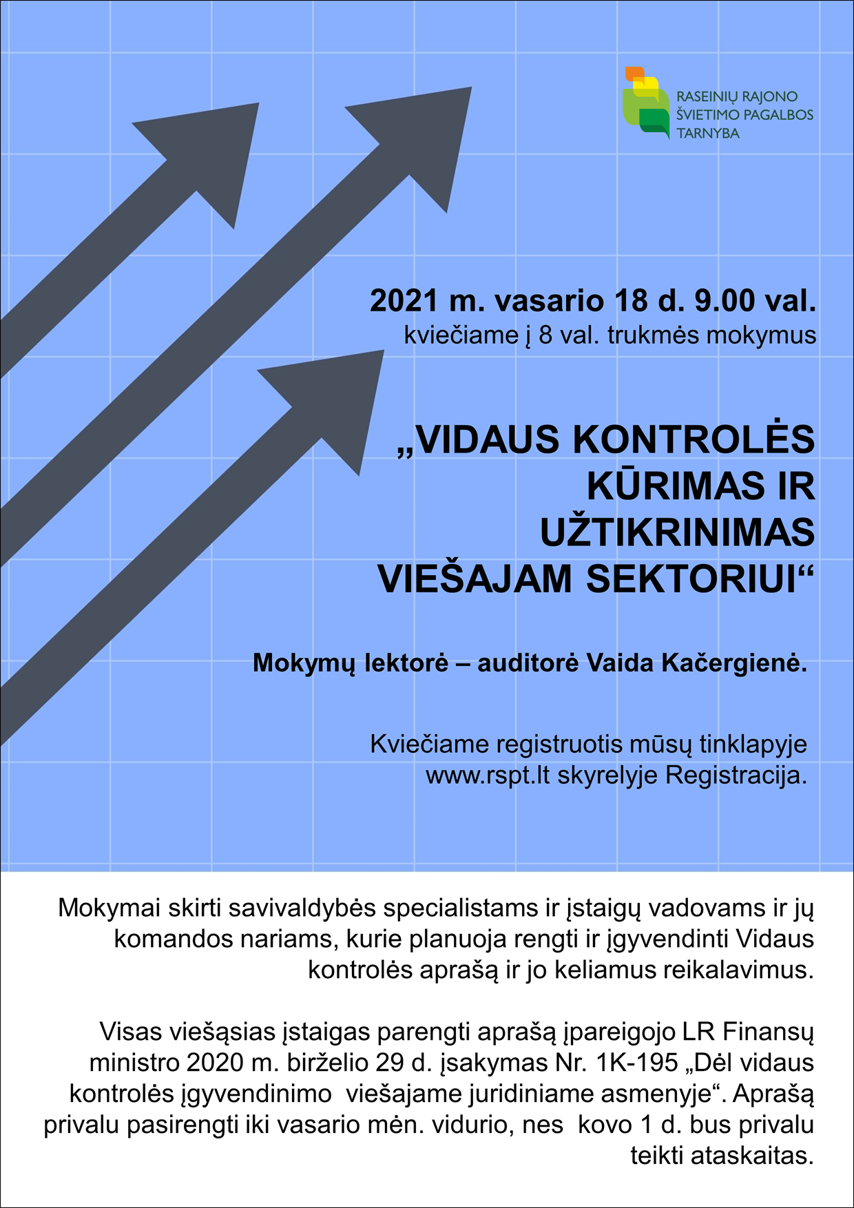 Plačiau2021 m. vasario18 d. 8.30 val. planuojami nuotoliniai 8 val. mokymai “Vidaus kontrolės kūrimas ir užtikrinimas viešąjam sektoriui” savivaldybės specialistams ir įstaigų vadovams ir jų komandų nariams, kurie planuoja rengti Vidaus kontrolės aprašą. Visas viešąsias įstaigas pasirengti aprašą įpareigojo LR Finansų ministro įsakymas 2020 m. birželio 29 d. Nr. 1K-195 „Dėl vidaus kontrolės įgyvendinimo viešajame juridiniame asmenyje“. Aprašą privalu pasirengti per vasario mįnesį, nes kovo 1 d. bus privalu teikti ataskaitas. Mokymus ves auditorė Vaida Kačergienė. Mokymų metu bus pristatytas aprašas, jo struktūra ir pateikta medžiaga, kuri padės pasirengti aprašą. Mokymų kaina planuojama 80 Eurų (Privačiame sektoriuje analogiški mokymai kainuoja 110 Eur).