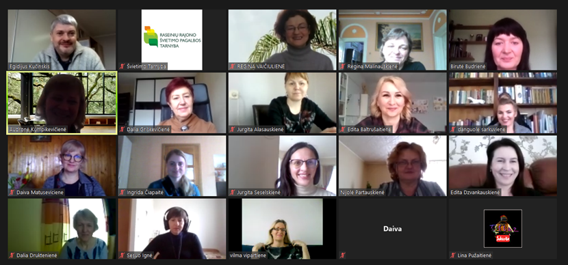 Raseinių ir Kelmės rajonų dorinio ugdymo mokytojai rinkosi į apskritojo stalo diskusiją Zoom platformoje, kurioje aptarė aktualius ugdymo klausimus ir pasidalino gerąja darbo patirtimi. Kelmės rajono tikybos mokytoja Regina Vaičiulienė ir etikos mokytoja Vilma Vipartienė skaitė pranešimus: „Erdvė, kurioje gimsta iššūkiai“, „Kas yra etika. Etikos reikšmė šiuolaikiniame pasaulyje“. Raseinių rajono tikybos mokytojos: Edita Baltrušaitienė skaitė pranešimą ,,Netradicinės aplinkos tikybos pamokose” ir pristatė netradicinį tikybos kabinetą, Birutė Budrienė dalinosi pastebėjimais apie darbą su specialiųjų poreikių turinčiais mokiniais tikybos pamokose. Etikos mokytojas Egidijus Kučinskis skaitė pranešimą ,,Svarbiausi etikos klausimai”. Abiejų rajonų mokytojai keitėsi gerąja darbo patirtimi, diskutavo. Kai tik leis aplinkybės, pasibaigus karantinui, mokytojai nutarė susitikti ir pabendrauti gyvai.