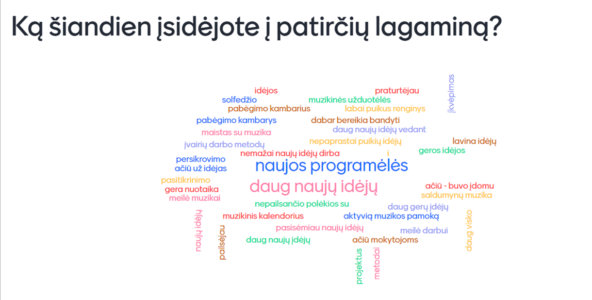 Daugiau nei penkias valandas respublikos muzikos mokytojai diskutavo, ko gi derėtų, dirbant nuotoliniu būdu, mokyti vaikus - muzikos, ar apie muziką. Bendraminčiai dalijosi inovatyviais metodais, savo patyrimais, įžvalgomis, kėlė problemas ir ieškojo atsakymų į iškylančius klausimus.