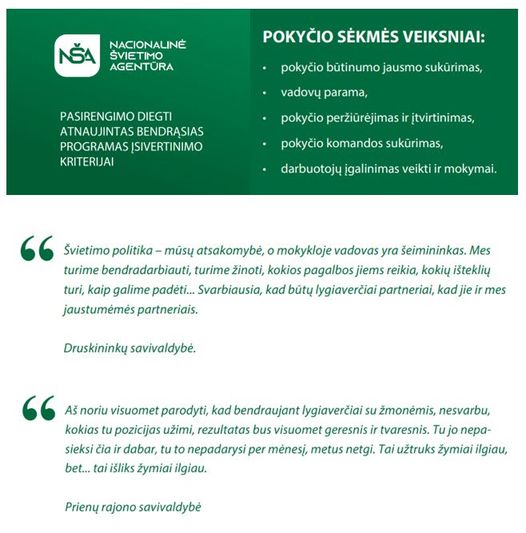 Visi šie svarbūs klausimai aptariami baigiamame maketuoti NŠA leidinyje "Pasirengimo diegti atnaujintas bendrąsias programas įsivertinimo kriterijai", kuris parengtas grupės ekspertų įgyvendinant ES projektą "Skaitmeninio ugdymo turinio kūrimas ir diegimas"