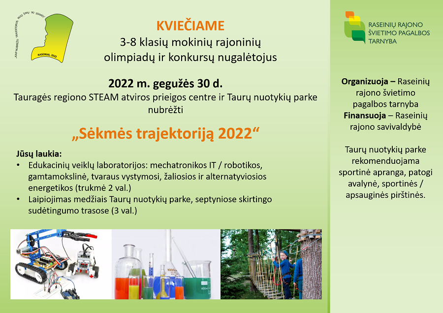 2022-05-12 Sėkmės trajektorija 2022 2022 m. gegužės 11 d. Raseinių Viktoro Petkaus progimnazijoje įvyko mokomųjų dalykų olimpiadų ir/ar konkursų rajono etapo nugalėtojų ir juos mokiusių mokytojų pagerbimo šventė „Kaip nubrėžti trajektoriją nuo žinių iki sėkmės“. Šventės organizatorius – Raseinių rajono švietimo pagalbos tarnyba.