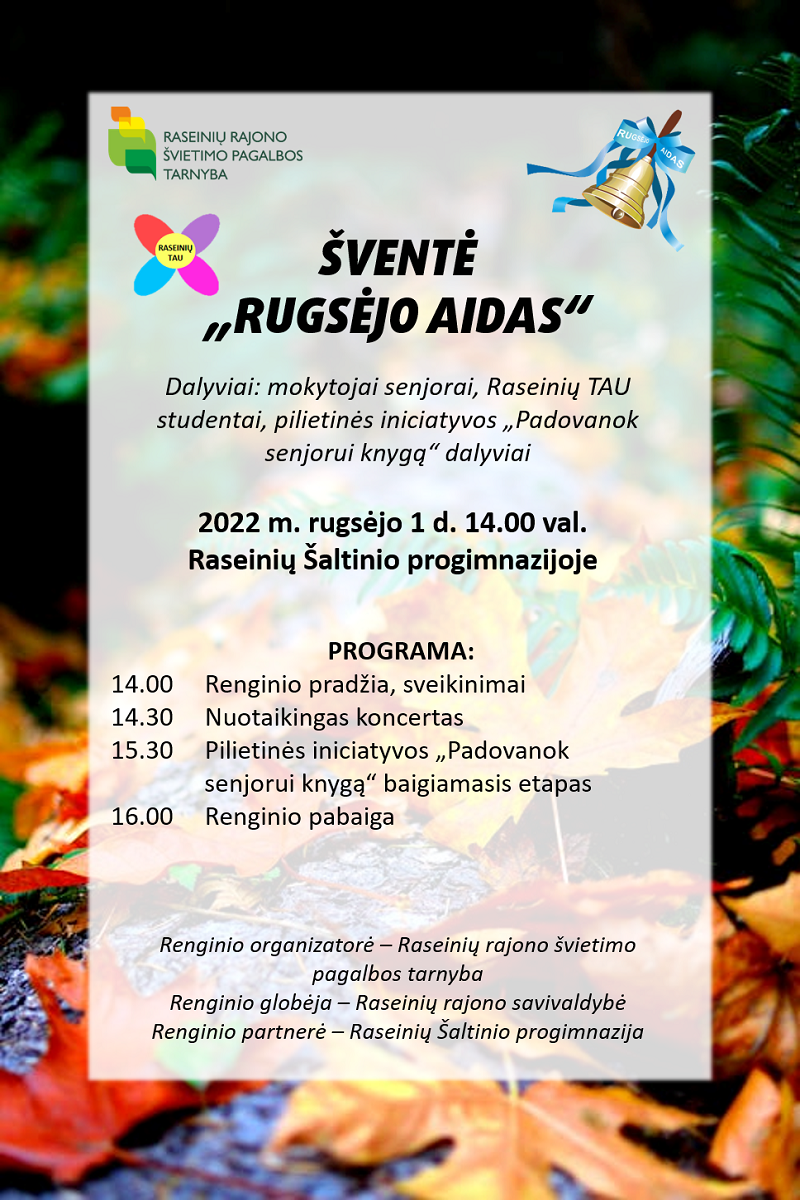 PlačiauRaseinių rajono švietimo pagalbos tarnyba tradiciškai organizuoja renginį Raseinių rajono mokytojams senjorams ir Raseinių Trečiojo amžiaus universiteto (TAU) studentams „Rugsėjo aidas“. Kasmet šventiškai nusiteikę įvairių rajono ugdymo įstaigų mokytojai senjorai ir Raseinių TAU studentai renkasi pasidžiaugti prasidėjusiais naujais mokslo metais.