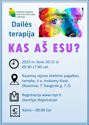 PlačiauKviečiame registruotis į dailės terapiją „Kas aš esu?“ , kuri vyks 2023 m. kovo 20-21 dienomis Raseinių rajono švietimo pagalbos tarnyboje (T. Daugirdo g. 7-2, Raseiniai, II aukštas, 201 mokymų klasė).